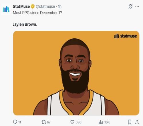 美媒NBA Memes写道:当杰伦-布朗的月最佳球员被抢走后,他就化身迈克尔-乔丹了。