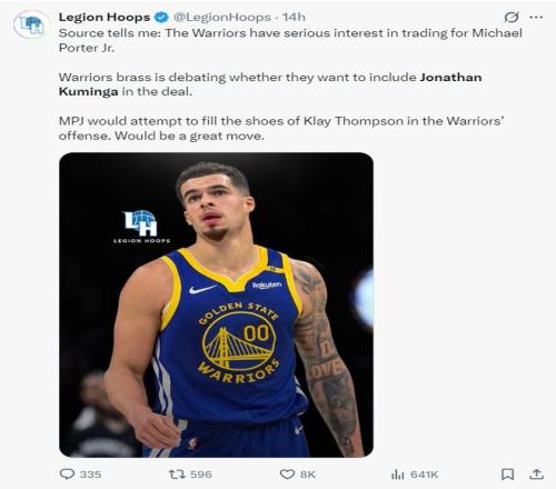 篮网媒体NetsFrequent则透露:我听说小波特已经是勇士成员之一,交易不是问题时间才是,他们正在就选秀权进行讨论。交易的第三方是国王队他们会得到库明加,我的消息源从未出过问题,我们一起见证这笔交易的达成吧。