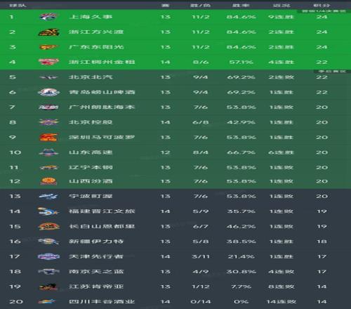 北京时间1月12日,今晚的CBA常规赛率先结束了3场比赛,我们看看最新积分榜的变动,主要的信息如下:浙江稠州103-68轻取四川豪取4连胜,北控94-91绝杀福建,天津98-93战胜了广州收获赛季第3场胜利!